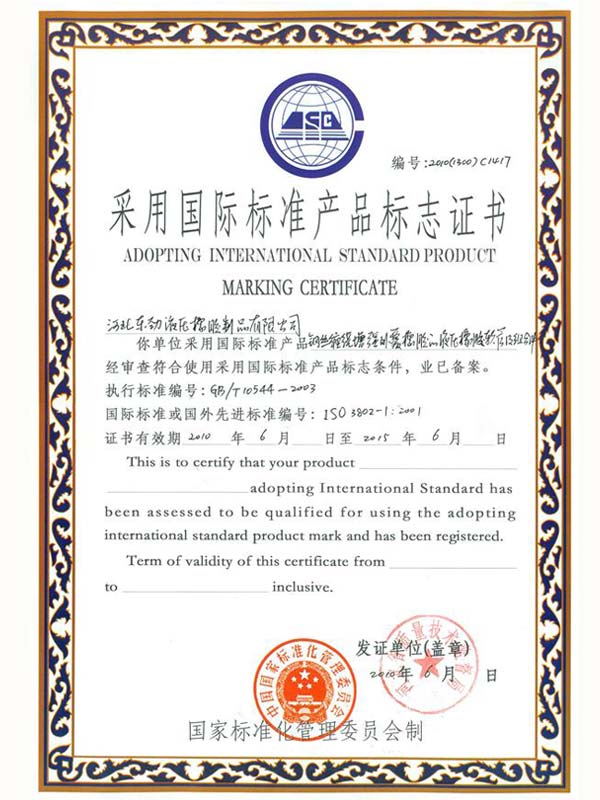 • 鋼編管?chē)?guó)際標(biāo)準(zhǔn)產(chǎn)品標(biāo)志證書(shū)